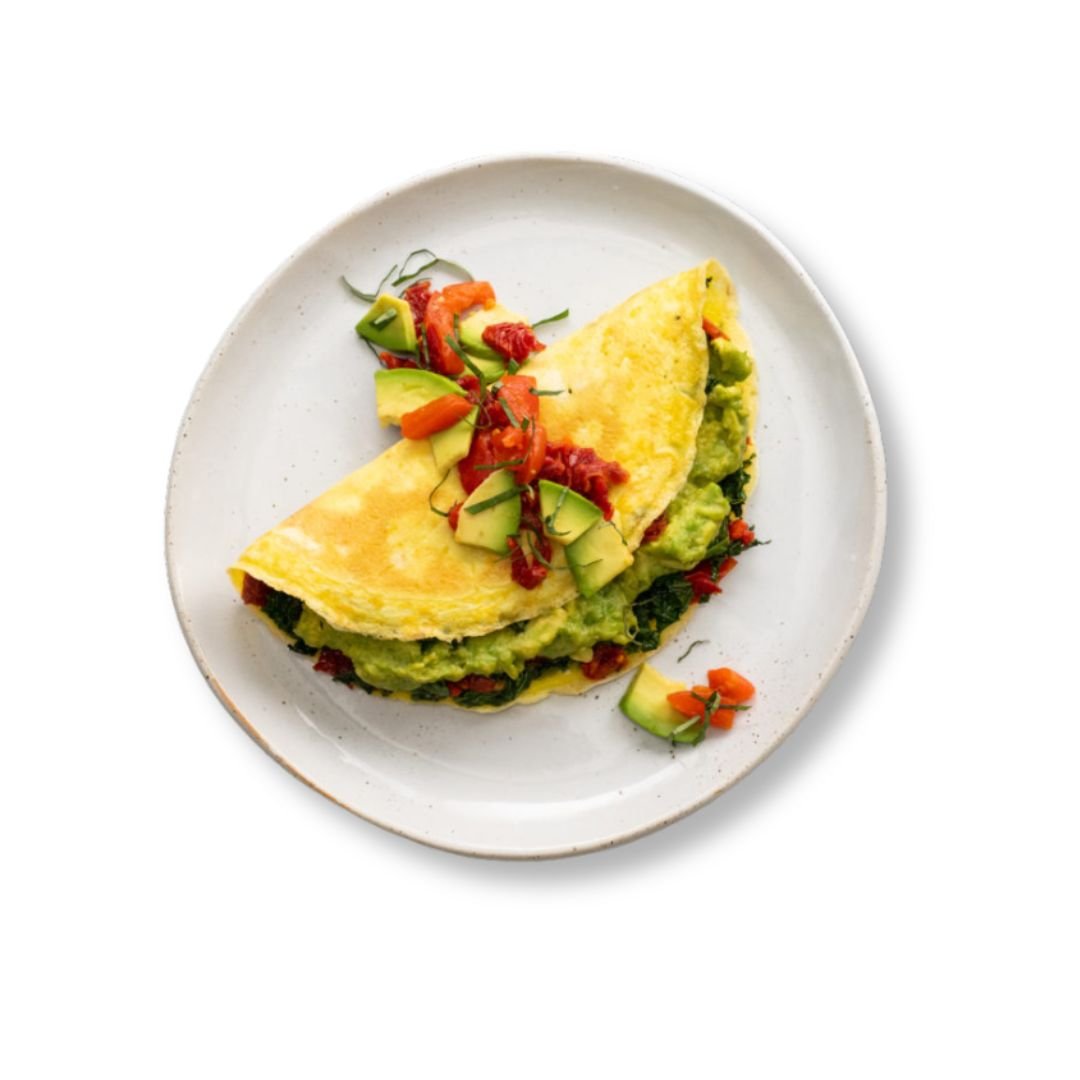 • Three eggs folded with avocado, tomato, and cheddar cheese.