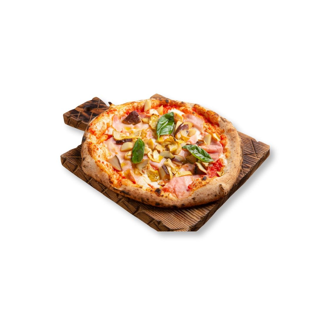 • Topped with tomato base, mozzarella cheese, and bacon.