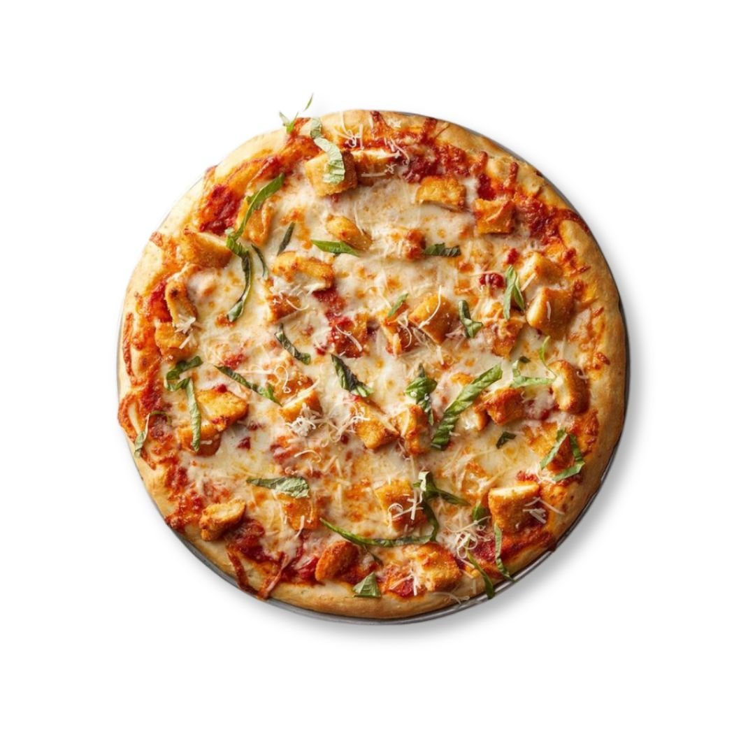 • Topped with tomato base, mozzarella cheese, and chicken breast.