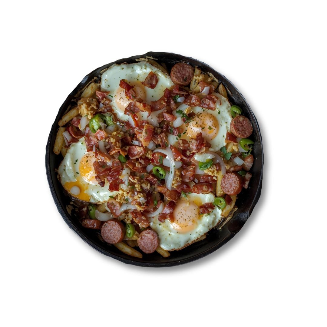 • Topped with scrambled eggs, bacon, sausage, onions, and green peppers.